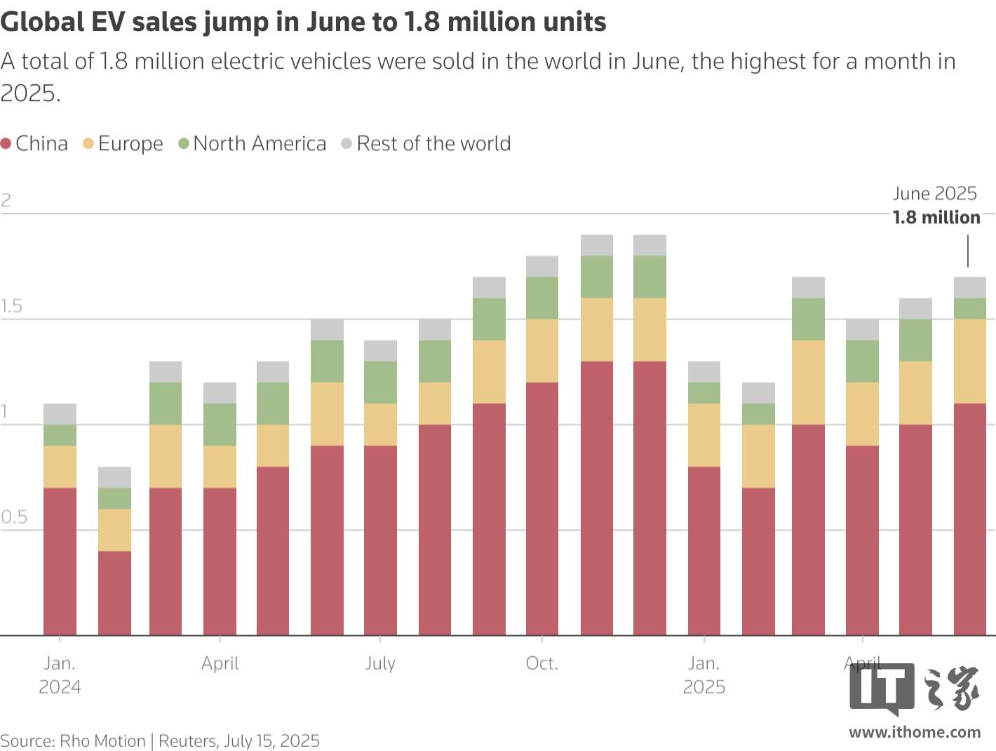 IT之家 7 月 15 日消息,据市场研究机构 Rho Motion 周二发布的最新数据显示,2025 年 6 月,全球纯电动汽车(BEV)与插电式混合动力车(PHEV)销量同比增长 24%,达到 180 万辆。其中,中国与欧洲市场继续扮演全球电动化转型的关键推动者,而北美市场则首次在全球市场中落于“其他地区”之后,表现不及预期。